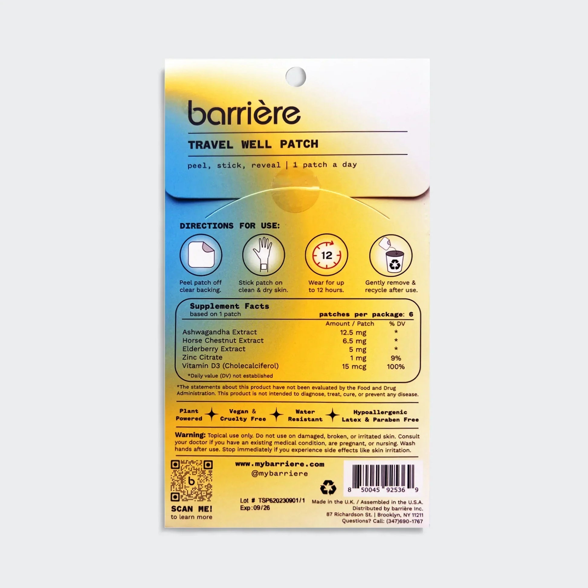 Put your body in vacation mode from the inside out. Formulated for pre, during, and post-travel, this patch includes an assortment of scientifically-backed supplements, vitamins and adaptogens shown to boost immunity, improve circulation, suppress inflammation and swelling, while reducing symptoms of stress, anxiety and fatigue.